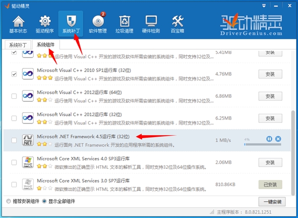 第二步:打开驱动精灵“系统补丁”中的“系统组件”一栏,安装提示您需要安装的.NET Framework组件(如下图)。