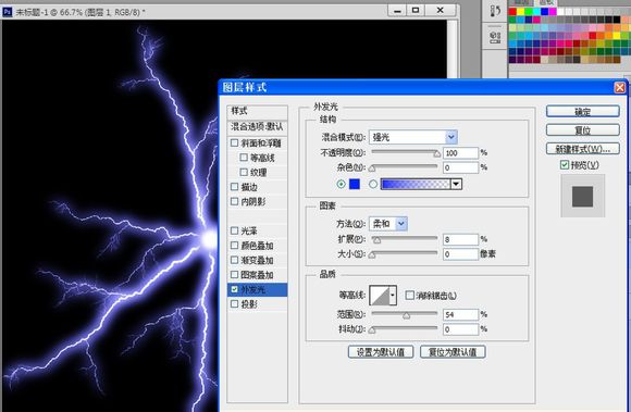勾选外发光 混合模式改为强光 不透明度100% 其他自己可以试着调节。