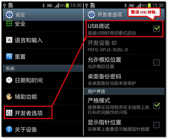 3.点击【开发者选项】,进入以后,把USB调试对钩取消。