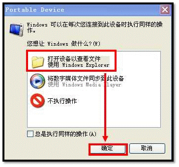 4.将手机通过数据线与电脑连接好,您的电脑会弹出移动盘符(如没有弹出,您可以进入我的电脑中,找到移动设备盘符,双击打开),然后选择【打开设备以查看文件】再按【确定】。