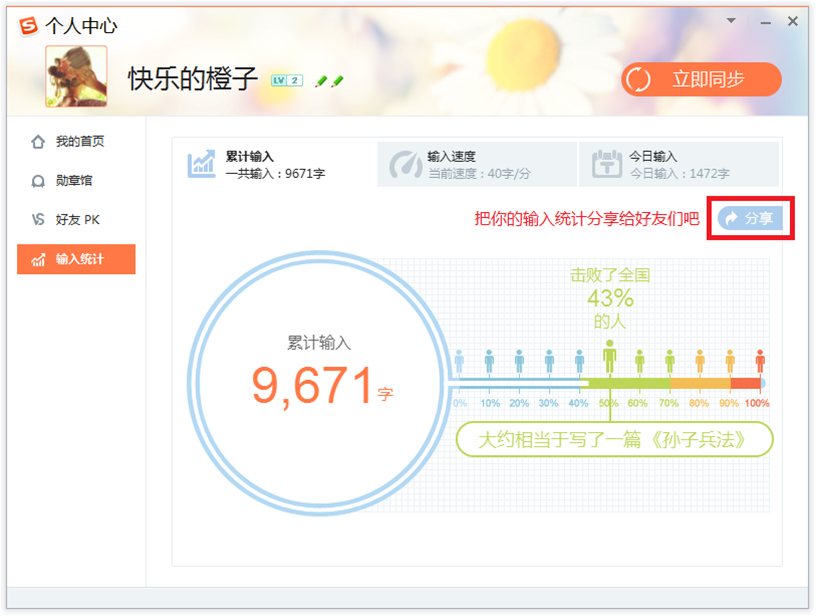 在输入统计界面中,您可以清晰地了解到您的累计输入字数、平均输入速度等统计数据。