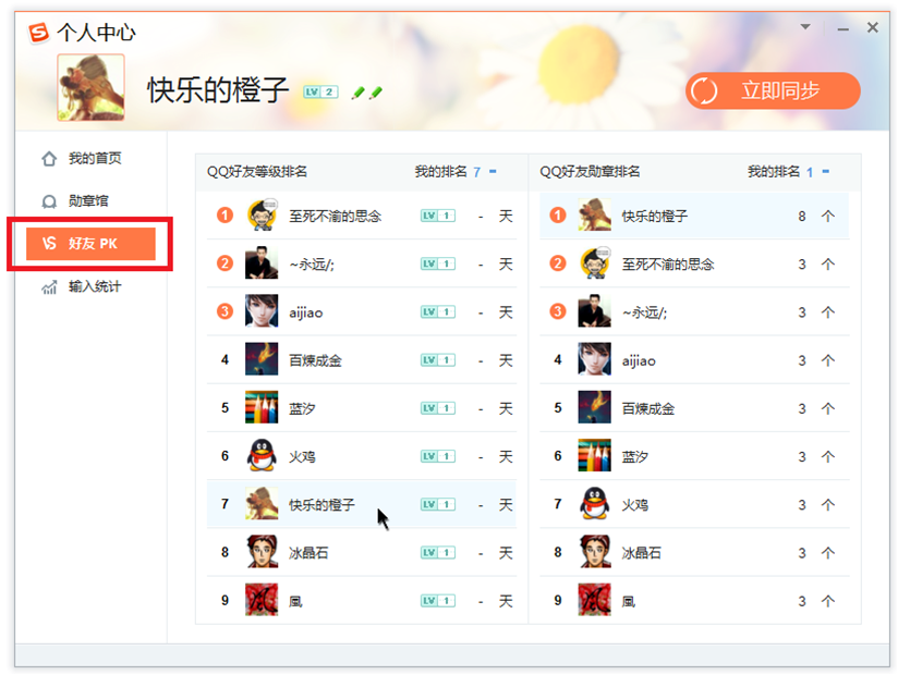 若您是通过QQ账户登录的,则可以在好友PK界面中看到您在QQ好友中的等级排名、勋章排名、排名趋势以及其它好友的排名情况。
