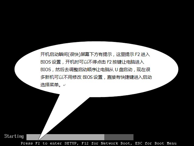 7、使用:使用U盘PE系统需要让电脑从U盘引导进入PE系统,U盘启动因电脑而异,具体操作请到百度搜索答案。电脑启动瞬间屏幕下方有提示,可以尝试按提示按键或从F1-F12等按键进入BIOS或启动选择菜单。