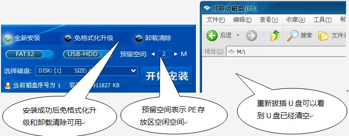 6、完成安装:安装完成后有完成提示框,重新拔插U盘可以看到U盘已经清空,并不表示没有安装成功,PE数据写入隐藏分区,资源管理器无法查看的,可以到我的电脑-管理(右键)-磁盘管理看到U盘分为两个区,隐藏区大小=PE数据大小+预留空间,若隐藏区大小减去预留空间(空闲大小)过小,说明没有安装成功,可以重试。