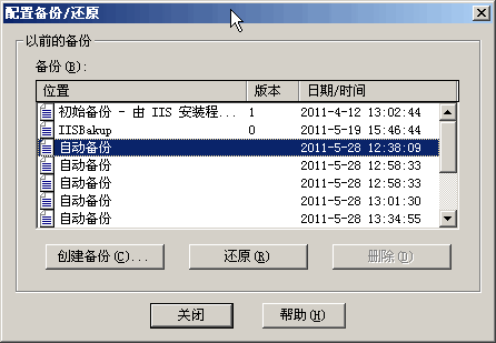 恢复IIS配置:如果过了一段时间,IIS的配置已经不再符合你的需要的话,你就可以恢复到你备份时的配置了。同样是打开“Internet服务管理器”,也是在原来的服务器名称上右击,在弹出的菜单中点击“备份/还原配置”,会出现和附图大致相同的窗口,不过这一次与上一次不同,原来的备份(如“IIS备份1”)就会出现在列表框里,而且处理选中状态。点击[还原]按钮,系统会弹出询问窗口,提示用户“还原是一项耗时的操作,它将覆盖所有当前的设置并导致全部服务的停止和重新启动,您确定要继续吗?”。如果当前没有人正在使用这些服务,就可以允许这样的操作,可以点击[是]进行IIS配置的恢复,如果当前有人正在使用这些服务,最好不进行恢复操作,以免用户数据的丢失。 在点击[是]按钮之后,系统会把当前IIS中所有的配置删除,把原来备份的配置恢复过来,这个过程要看IIS本身站点配置的数量而定,一般一两分钟就可以完成了。