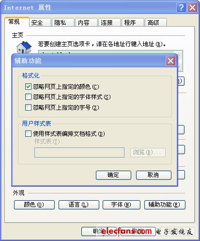 4、打开ie浏览器,选择“工具”栏中的“internet选项”,点击“辅助功能”按钮,在“忽略网页中指定的颜色”前打钩。