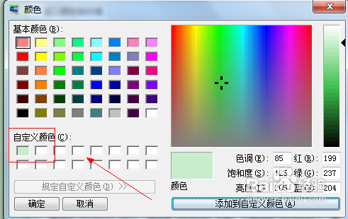 5、在颜色中将色调调整为85;饱和度调整为125,亮度调整为205,点击添加到自定义颜色中。