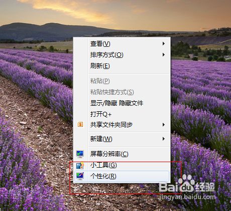 1、在电脑桌面空白处点击右键“个性化”按钮。(注:如果右击没有个性化选项的朋友请看下面win7其他版本设置。)