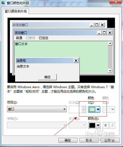 4、在弹出的窗口颜色和外观中,将项目选为“窗口”颜色选为其他,进入到颜色选择。