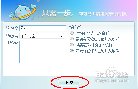 3、输入群的名称和分类,点击提交按钮即可创建,如图所示: