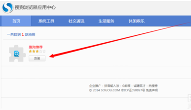 3、在搜狗浏览器应用中心页面中,搜索“搜狗推荐”应用插件。搜狗完成后,点击“搜狗推荐 安装”按钮。