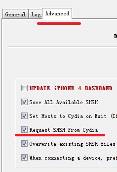 3、.如果你的机器已经越狱,想从cydia服务器恢复shsh,请点选Advanced选项,在Request shsh from cydia前面打勾,如果是新机器或未越狱的机器请不要打勾。