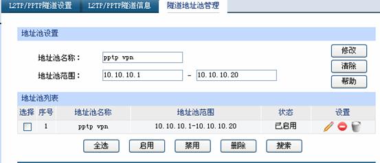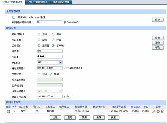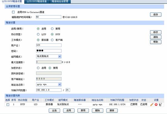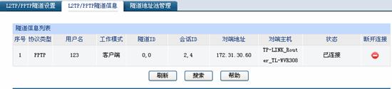 3. 客户端和服务器端条目建立后,都选择启用,成功建立后在服务器端和客户端的L2TP/PPTP隧道信息中将有条目: