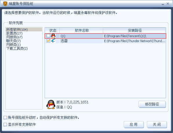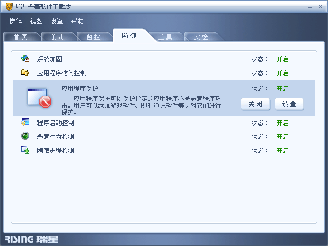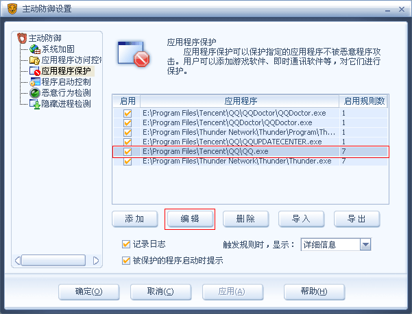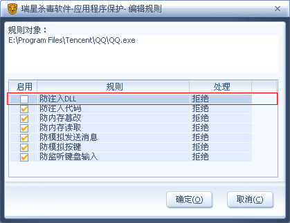 方法二:请打开瑞星2008,点击选项卡中的“防御”,选中“应用程序保护”,点击“设置”。然后选中如QQ等相关的软件双击或点击“编辑”按钮,把“防注入DLL”前面的“√”去掉。操作如下图: