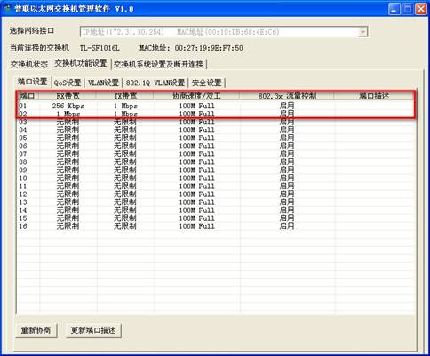 通过RSSManager管理软件连接交换机(本文以TL-SF1016L为例),进入菜单:“交换机功能设置”→“端口设置”,配置界面如下图: