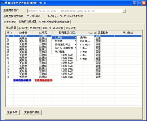 1. 在需要配置限速的端口所在栏上点击右键,将弹出配置菜单: