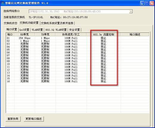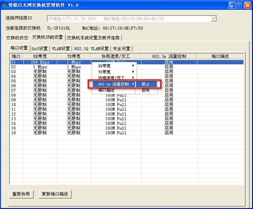 3. 为了正常的使用端口带宽限制功能,建议将交换机所有端口的802.3x流量控制功能禁止: