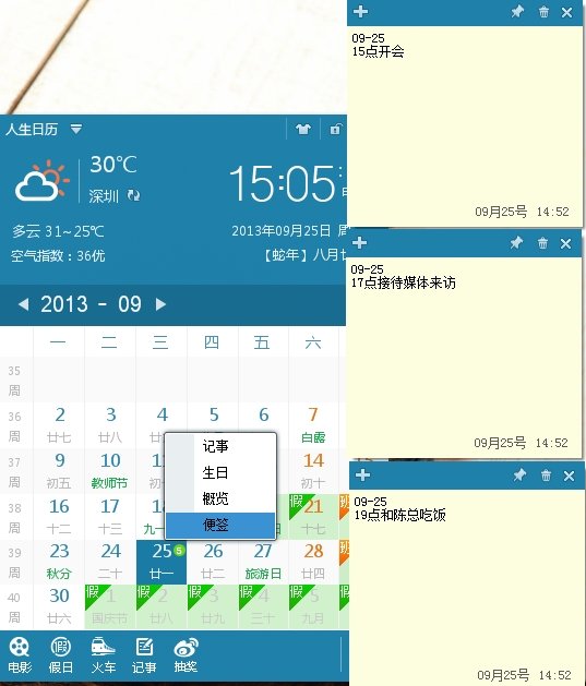 同时新增桌面便签记事功能,方便用户记录当日所需完成工作,并可任意锁定在电脑桌面任意一个位置;对于工作较为繁琐的白领们来说,是一个很强大的功能,把当天功能用人生日历便签记录下来并锁定在电脑桌面上,完成一件可以关闭一个便签或者在便签里删除已完成事项;这样一来再繁琐的工作也不担心会忘记了!