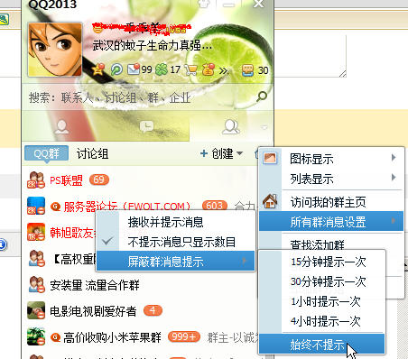 2、对每个群进设置,很重要的群设置弹出消息,不是很重要的就设置成只显示条数,对一些太活的群我们可以设成不接受,等需要的时候再打开也不迟。