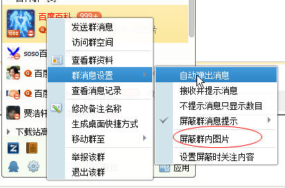 方法:选择一个群点鼠标右键,选择群消息设置-》屏蔽群内图片。