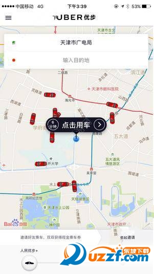 一、打开Uber优步中国,然后进定位你所在的位置,同时输入目的地,点击“点击用车”按钮;