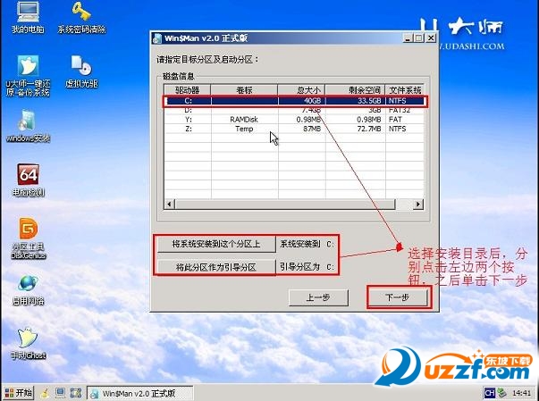 4.选择系统安装目录,之后分别单击左侧的两个按钮,注意此过程可能会提示你格式化所选分区,单击“是”即可
