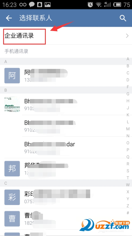 3、选择后会弹出需要的联系人列表,可以选择手机通讯录的联系人,点击企业联系人可选择企业微信的成员。