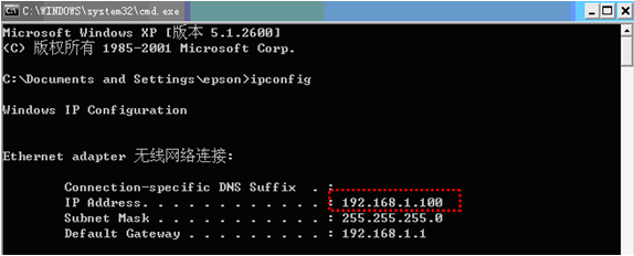 2)在光标所在位置输出“ipconfig”按回车键,可以查看网络状态,本文主机IP地址为:192.168.1.100如图(3);