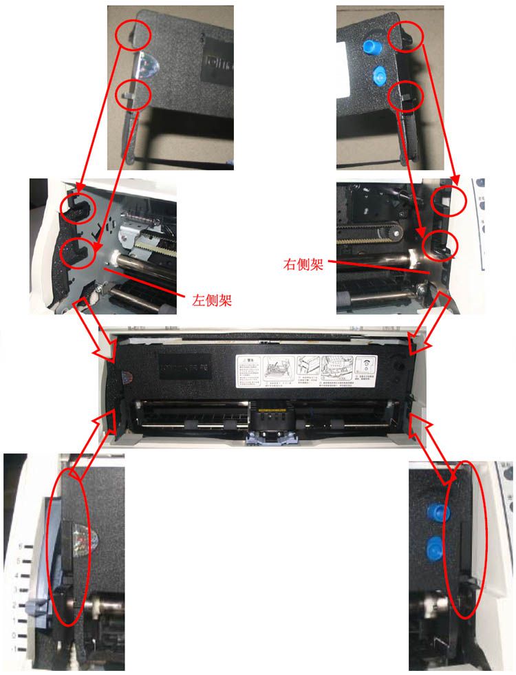步骤三、如下图所示,将色带架的卡位安装到打印机左/右侧架对应的位置。