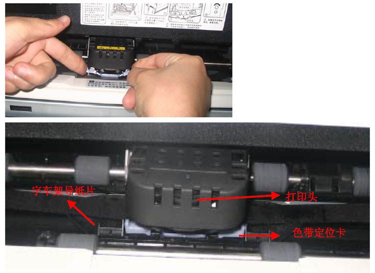 步骤四、如下图所示,将色带定位卡推进“打印头”与“字车架导纸片”之间。