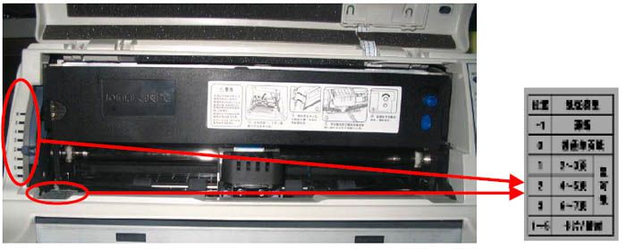 步骤二、如下图所示,把纸厚调节杆调整为“换色带档”。(此步骤只对FP-570K、FP-570KII、FP-580K(JJ)、FP-730K机型有效)