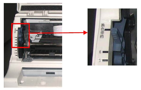 步骤六、如下图所示,把纸厚调节杆调整为所需的刻度上。(此步骤只对FP-570K、FP-570KII、FP580K(JJ)、FP-730K机型有效)