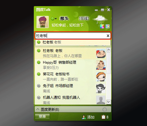 直接打开图度talk,在搜索框里输入关键字查找相关联系人,点击查找结果即可开始会话。