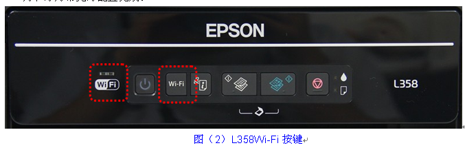 2. 按住打印机面板的Wi-Fi按键3秒钟,如图(2),左侧Wi-Fi指示灯开始红灯和绿灯交替闪烁,当红灯和绿灯常亮时配置完成。