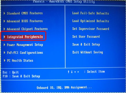 开机后,按“Delete”键或者“F10”键进入CMOS,使用小键盘的方向按键选择“Integrated Peripherals”,按下“Enter”键,如图(3);