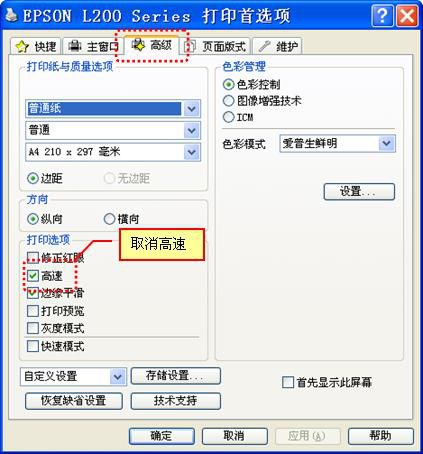 2.打印普通文本和图表时,推荐使用“普通”或“精细”模式,取消“高速”选项。