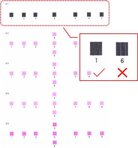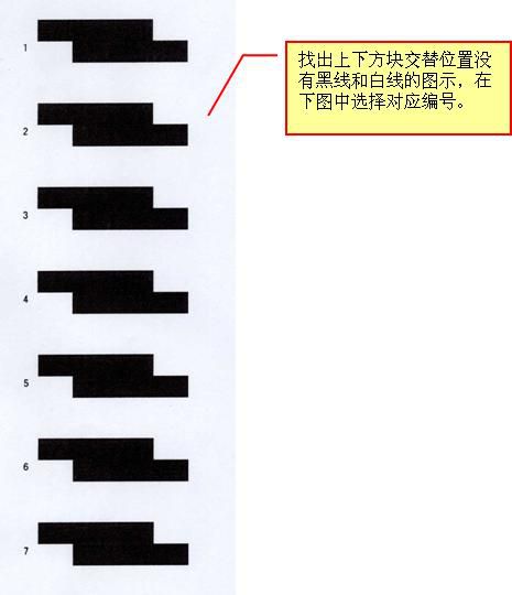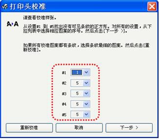 4. 打印完毕后查看校准样张,如图(7),样张中共有5组校准图案(#1、#2、#3、#4、#5),其中#1有7个方块为黑白垂直校准样张,#2、#3、#4、#5每组有9个黑色色块,请在同组中选取其中未出现可见的白色竖纹的色块,如图(7)校准样张的#1组中,1号色块没有白色竖纹,在图(8)#1对应的下拉列表中选择序号“1”,点击“下一步”;