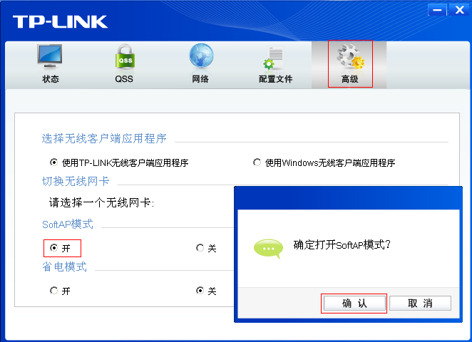 打开 TP-LINK无线客户端应用程序 选择 高级,SoftAP模式 选择 开,点击 确认 打开Soft AP模式。如下图: