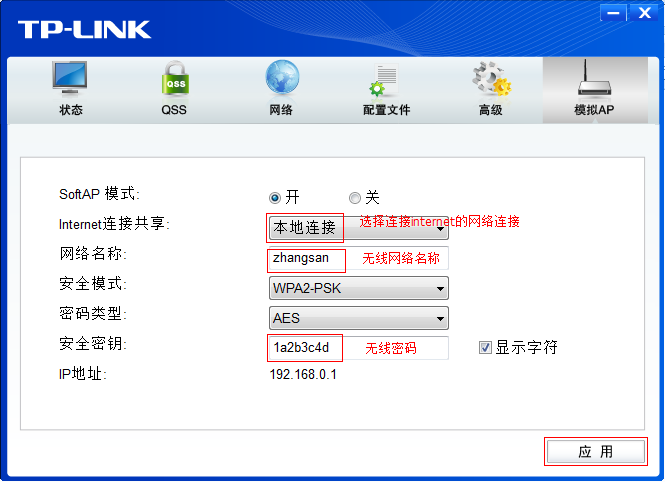 2、 在 网络名称 及 安全密钥 中修改SoftAP的SSID与无线密码 (本例中选择的网络连接为本地连接,网络名称为zhangsan, 安全密钥 为1a2b3c4d),点击 应用,如下图: