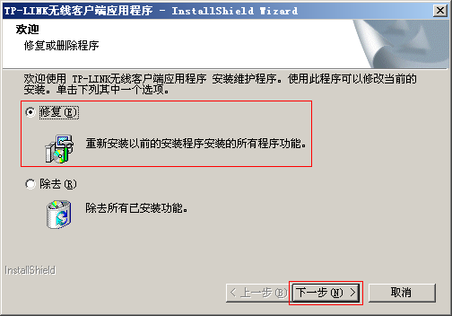 下载客户端软件并解压,打开解压之后文件夹,双击运行(setup.exe),选择 修复,并点击 下一步,如下图: