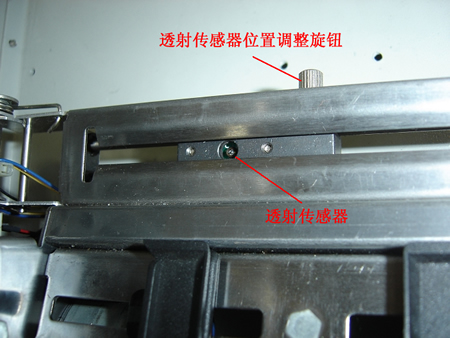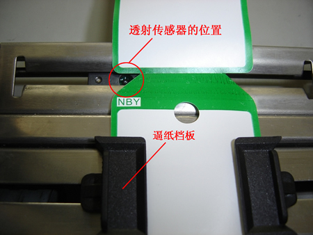 3)将带牌纸安装在走纸通道内,调整逼纸块位置,使带牌纸不能左右晃动,然后左右移动透射传感器位置调整旋钮,使透射传感器接收管对准带牌左侧缺口位置,如下图所示: