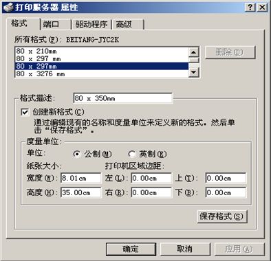 在控制面板中打开[打印机和传真],选择[文件]---[服务器属性],在[格式]属性中选择[创建新格式],然后在[格式描述]中定义该纸张类型的名称以及纸张大小的宽度、高度打印区域页边距,然后单击[保存格式]按钮并单击[确定]按钮: