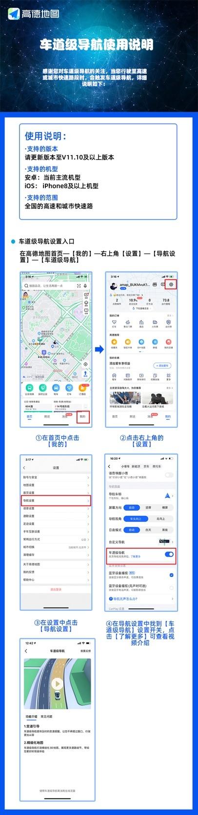 而从11月2日开始,高德车道级导航高清版将支持全国的高速和城市快速路,意味着高德车道级导航服务已覆盖全国用户。