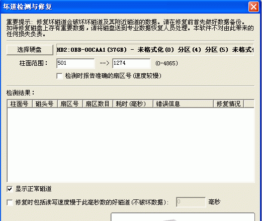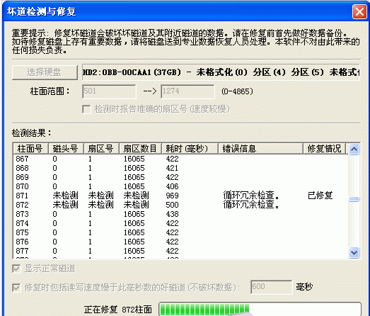 重要说明:坏道修复会破坏坏道附近的数据!在可能的情况下,一定要先对磁盘数据进行备份。如果坏道区域存有重要数据,请不要用本功能修复坏道,而应该将硬盘送到专业的数据恢复中心恢复数据。坏道修复会破坏数据,而不是恢复数据!另外需要说明的是,并不是所有的坏道都能修复,本功能可以修复的坏道种类有限。