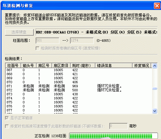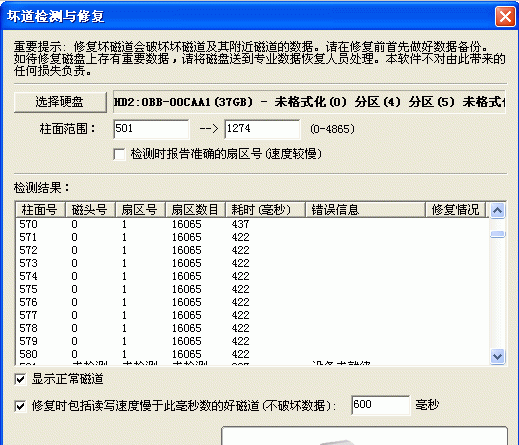 如果没有进行过坏道检测,或者运行本软件之前用其它软件进行过坏道检测,为节省时间,也可以在不检测的情况下直接用本软件修复坏道。