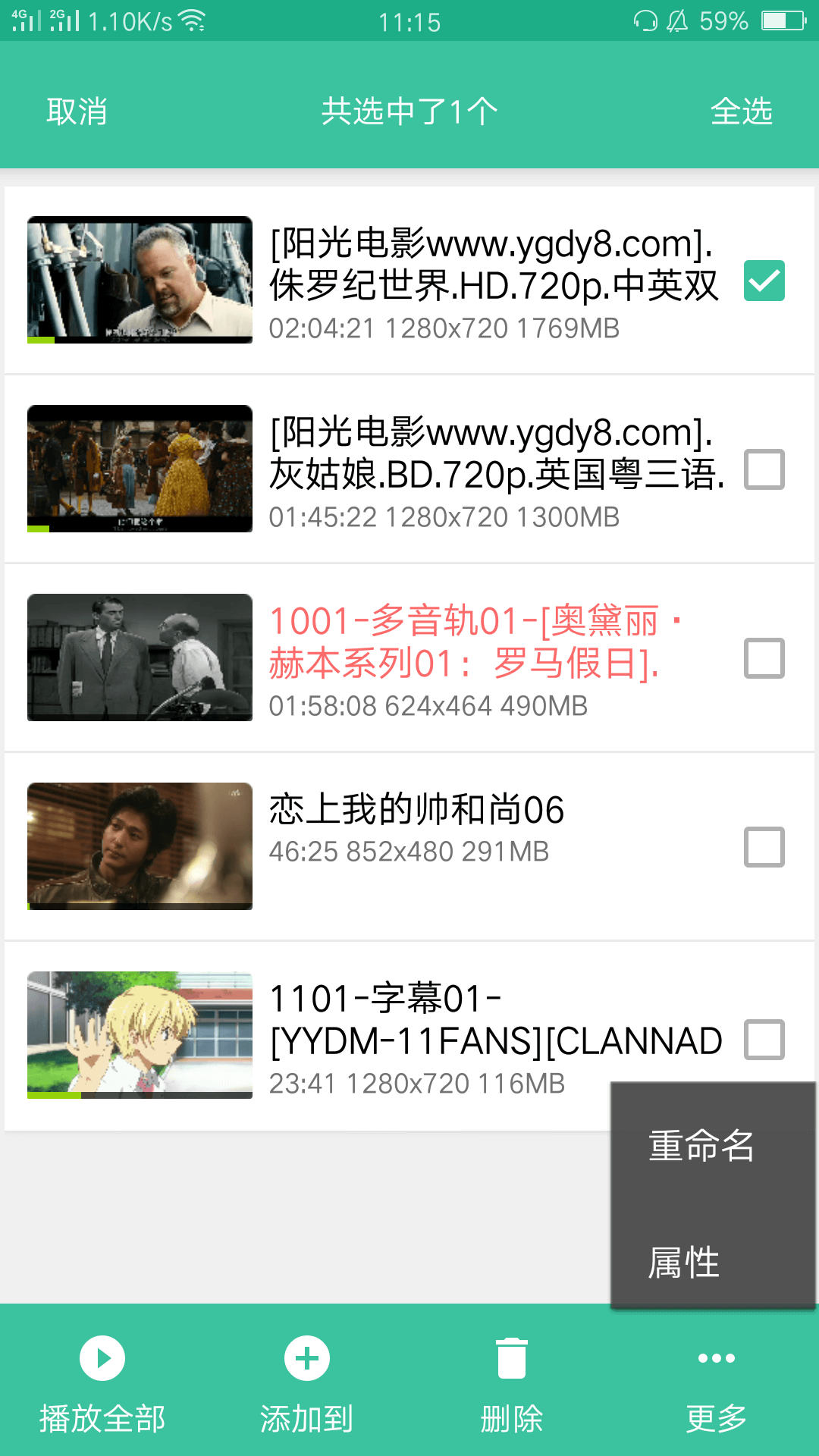 长按文件名可以实现播放全部、添加到播放列表、删除文件、重命名、查看属性功能