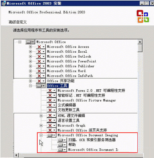Microsoft Office Document Image这个程序的安装一般都是附带Microsoft Office下载下来的,所以我们只需要在安装Microsoft Office的过程中进行处理即可,我们以2003为例子,在安装过程中选择自定义,如图所示: