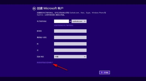 请选中“创建一个新帐户”,然后在新的帐户页面上,选中“继续使用我的现有帐户”。