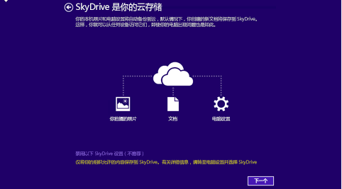 如果这是你首次使用 Windows 8.1 或 Windows RT 8.1 设置电脑,将看到新的 SkyDrive 选项。在此屏幕上单击“下一个”
