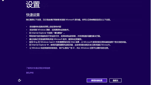 你将看到建议设置(称为“快速设置”)的列表。 要接受这些设置并继续,请点击或单击“使用快速设置”。 完成设置后,你可以在以后更改任意这些设置。 如果你想立即更改这些设置中的某些设置,请点击或单击“自定义”